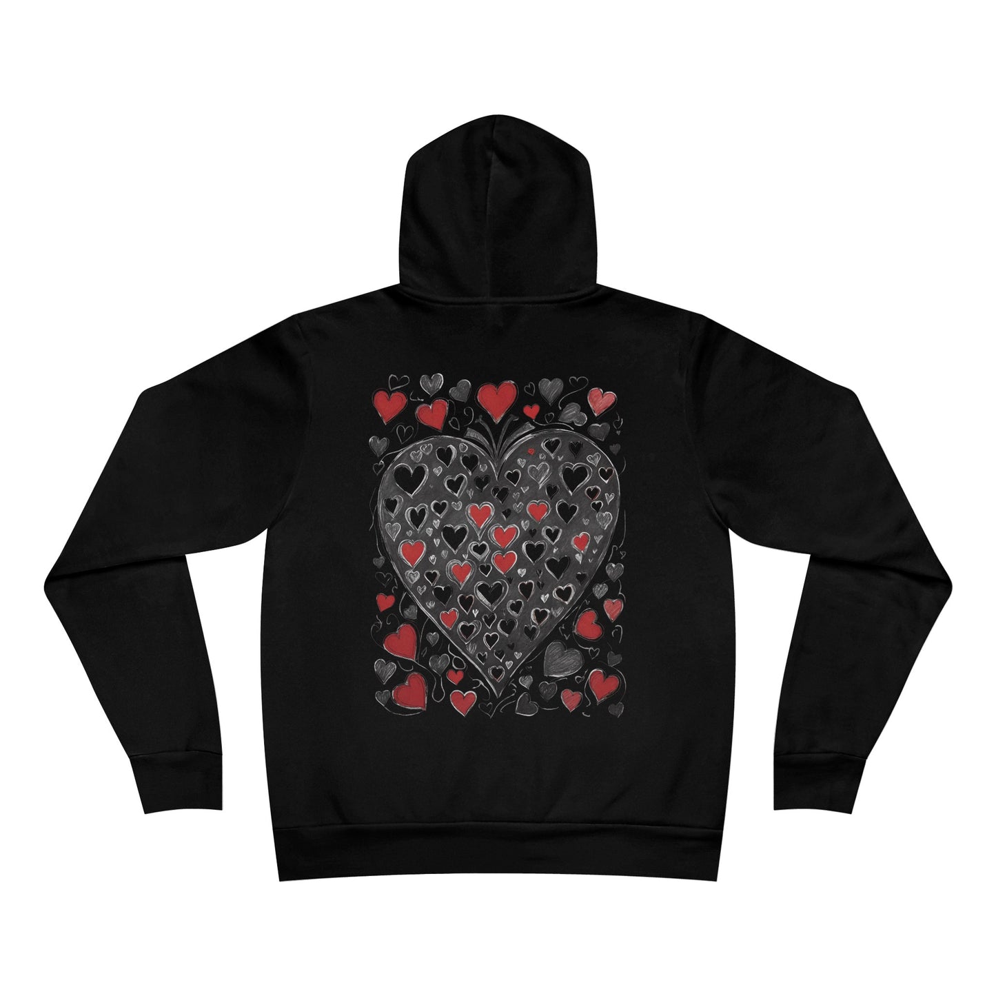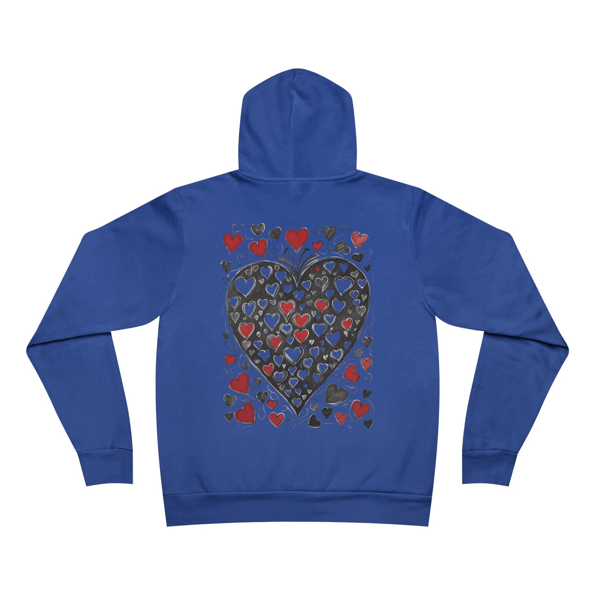 The unisex sponge fleece pullover hoodie is a blend of Airlume cotton and polyester. The percentages vary according to color. A pouch-style pocket spreads across the lower half of the garment’s front. The hood can be tightened with a white drawcord. Both cuffs and waistband have ribbing for extra grip.