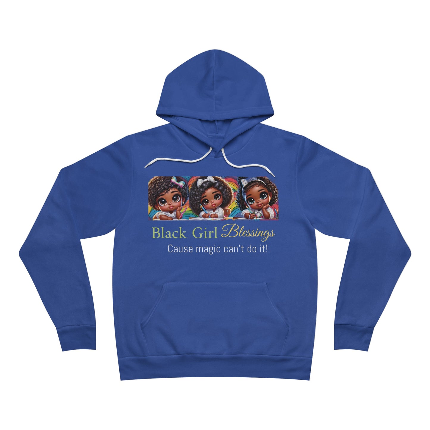 The unisex sponge fleece pullover hoodie is a blend of Airlume cotton and polyester. The percentages vary according to color. A pouch-style pocket spreads across the lower half of the garment’s front. The hood can be tightened with a white drawcord. Both cuffs and waistband have ribbing for extra grip.