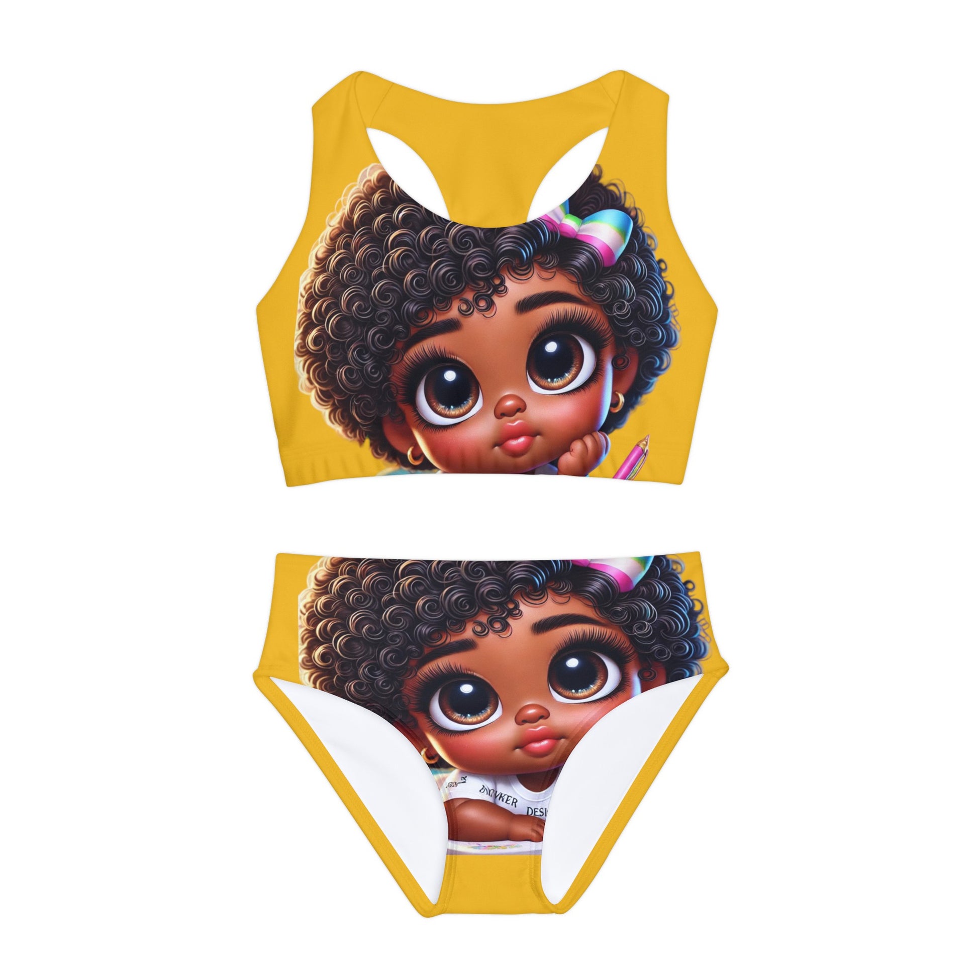 A fun two-piece swimsuit will get your store ready for summer. Customize it with bold colors and original art – we'll print and ship it for you. The two garments are made from 82% microfiber polyester and 18% spandex, creating a four-way stretching, comfortable material.